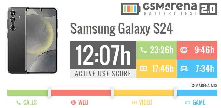 طبق تست باتری انجام شده توسط gsmarena، باتری گوشی سامسونگ گلکسی S24 انرژی موردنیاز برای ۹ ساعت و ۴۶ دقیقه وبگردی، ۱۷ ساعت و ۴۶ دقیقه تماشای ویدئو، ۷ ساعت و ۳۴ دقیقه بازی، ۲۳ ساعت و ۲۶ دقیقه مکالمه و ۱۲ ساعت و ۷ دقیقه کاربری روزمره را تأمین میکند.