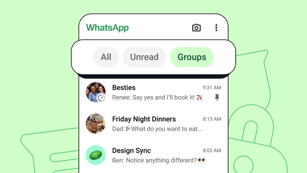 همچنین کاربران با ضربه زدن روی زبانه Groups صرفا چتهای گروهی و زیرگروههای انجمنها را مشاهده خواهند کرد. به گفته واتسآپ، روند اجرای برنامه و یافتن مکالمه مناسب بایستی سریع، ساده و یکپارچه باشد و بیتردید فیلترهای جدید به تحقق تمامی این اهداف کمک خواهند کرد. حداقل این ویژگی موجب کاهش اقدامات پیمایشی انجام شده از سوی کاربران خواهد شد.