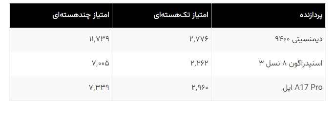 ز طرف دیگر، تراشهی A17 پرو که در بهترین گوشی اپل قرار دارد، همچنان حدود هفت درصد در عملکرد تکهستهای قویتر ظاهر شده است؛ در عوض دیمنسیتی ۹۴۰۰ توانست ۶۰ درصد قدرت چندهستهای بیشتری به نمایش بگذارد.